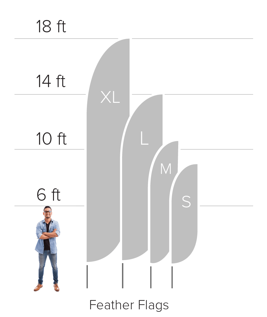 Feather flags can be printed on both sides and come in 3 large sizes including 10.5’ (24” x 104” flag), 14’ (28” x 138” flag), and 16’ (30.75” x 137.75” flag), offering great visibility. Feather flags are printed on washable polyester fabric, allowing you keep your flags looking fresh even after they’re subjected to outside dust and grime.